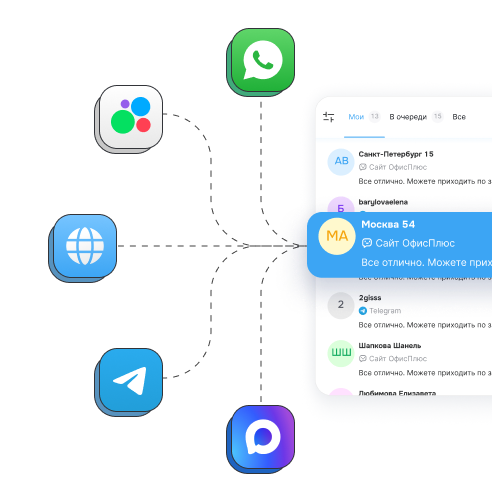 Все обращения клиентов из мессенджеров и соцсетей — в одном окне. Упрощает работу команды и ускоряет ответы.