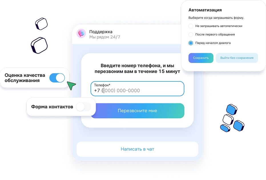 Настраиваемые автоответы при входе в чат, в нерабочее время или при отсутствии оператора. Приветствия могут быть персонализированными по UTM-меткам, гео или времени суток.