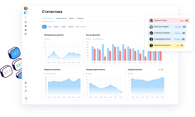 Анализируйте эффективность: кто отвечает быстрее, у кого больше закрытых диалогов, где просадки.