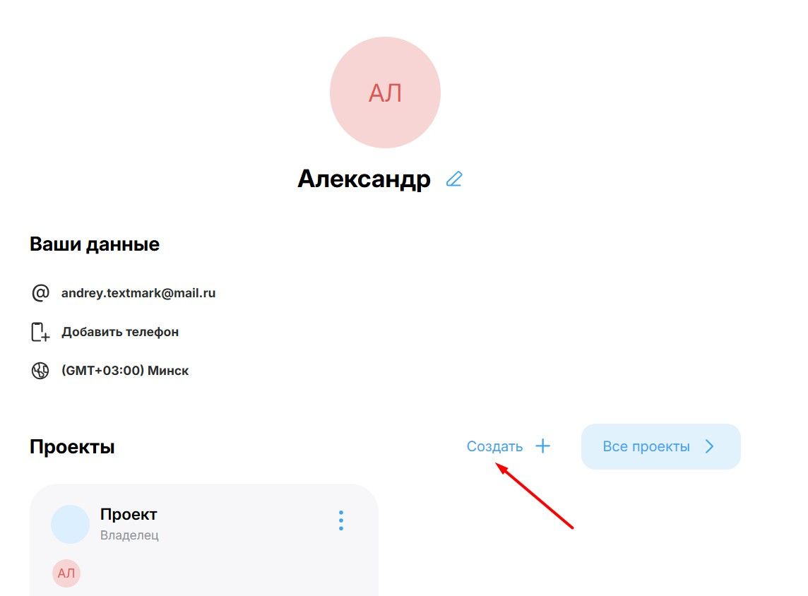 Во вкладке «Аккаунт» и во вкладке «Проекты» вы найдете кнопку «Создать». Нажмите на нее.