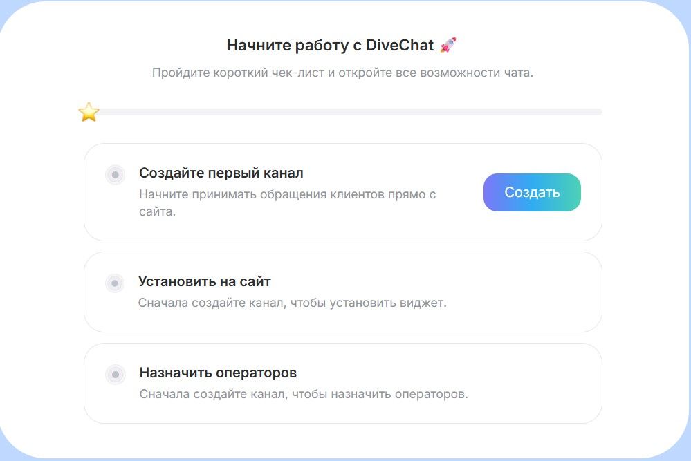 Теперь создадим первый канал. В терминологии Dive Chat «Канал» — это конкретный инструмент связи (виджет для сайта, бот Telegram или WhatsApp).