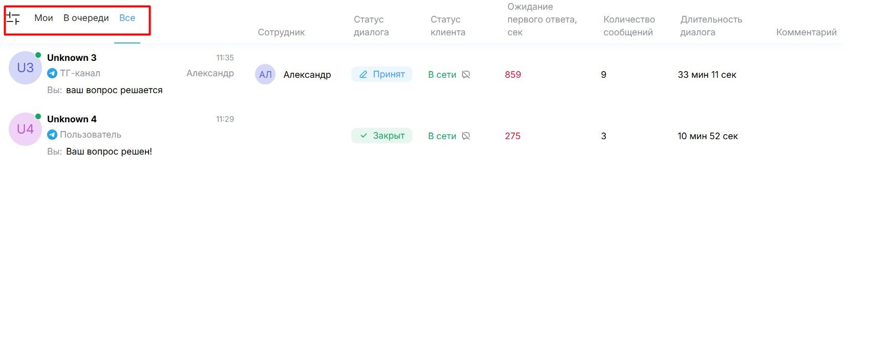 - Смысл. Здесь отображаются все диалоги: новые, те, что находятся в работе у ваших коллег, и уже завершенные (архивные).