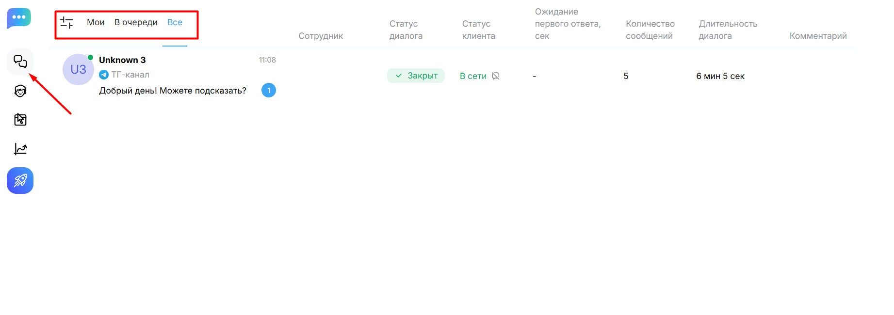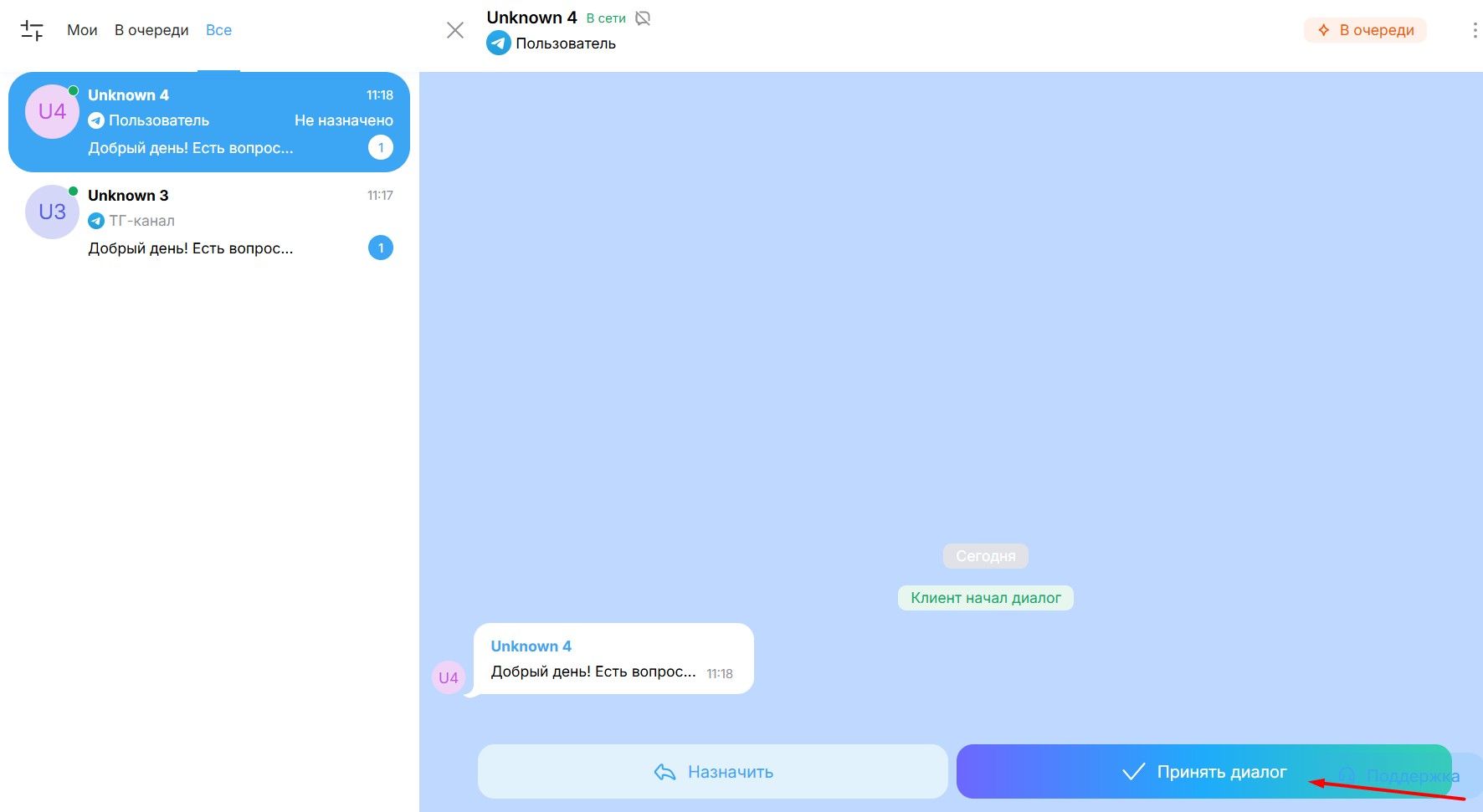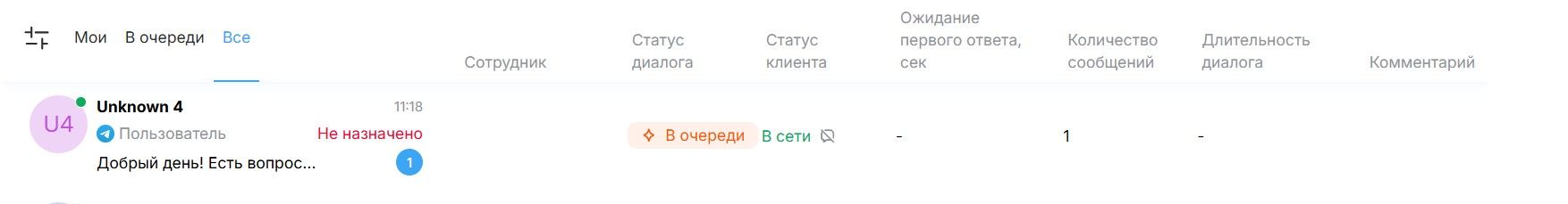 - В очереди. Новые обращения, на которые еще никто не ответил. Если здесь есть цифра — клиент ждет помощи.