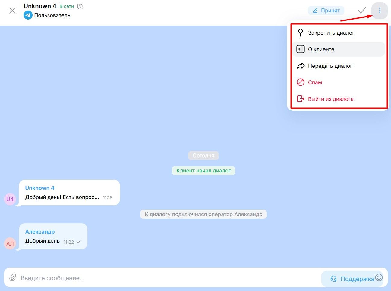 - Комментарий. Внутренняя заметка, если коллега передал вам этот чат с пояснениями.