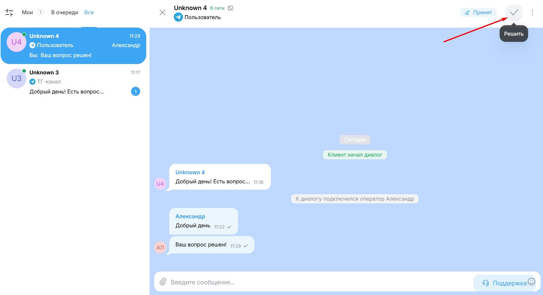 Когда вопрос клиента решен, чат необходимо закрыть, чтобы он не искажал статистику и не перегружал ваш рабочий список: