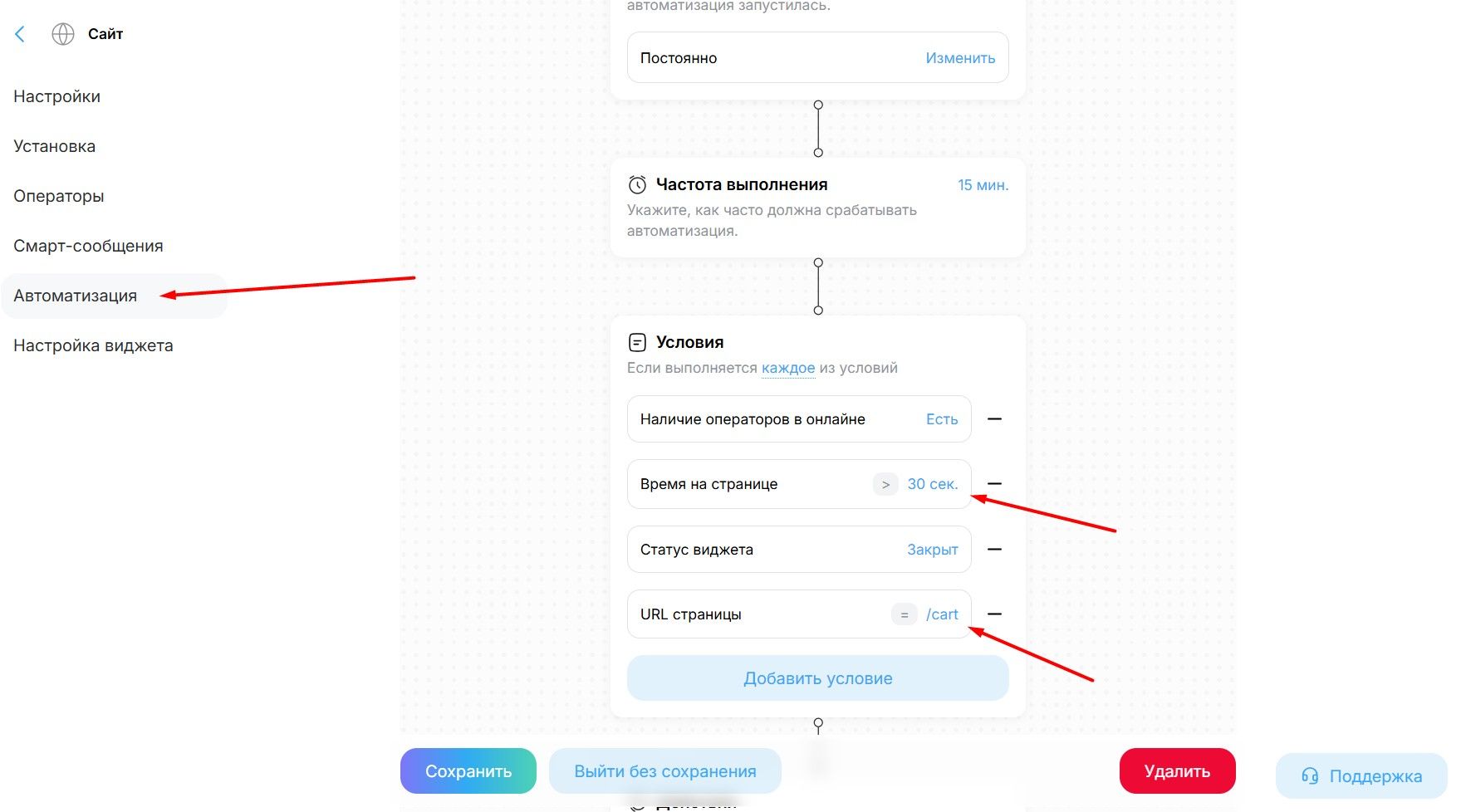 - Настройте условия (например, Время на странице > 30 сек + URL содержит /cart).