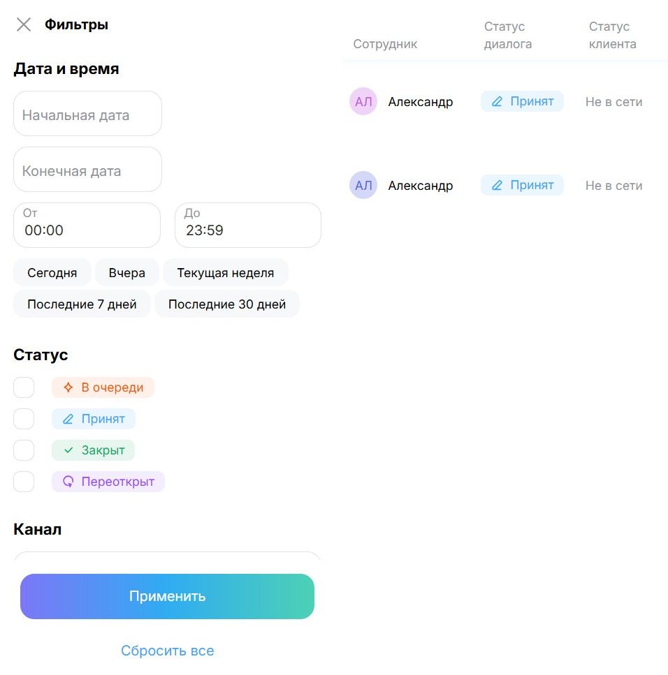• Статус. Быстро найдите все «Переоткрытые», «Закрытые», «Принятые» или диалоги «В очереди».