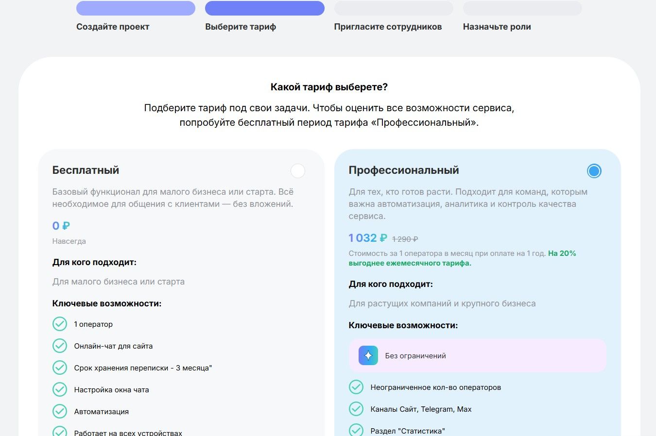 Если вы только начинаете знакомство с сервисом, выберите бесплатный тариф. В любой момент вы сможете перейти на Профессиональный в настройках проекта.