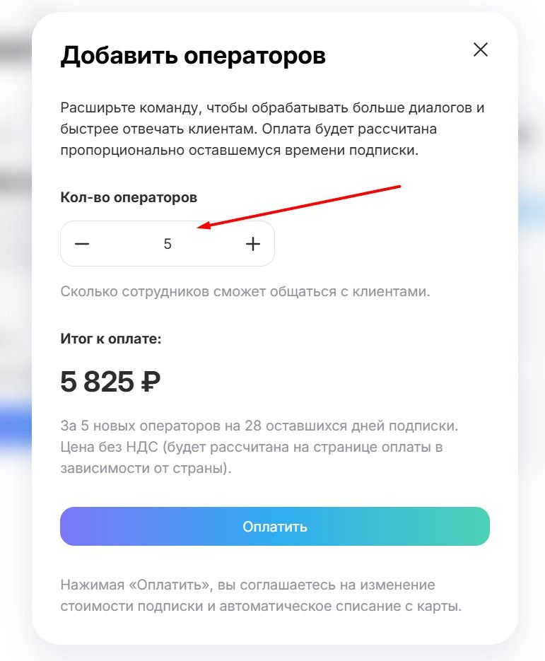 1. Укажите количество. В поле «Кол-во операторов» выберите, сколько дополнительных сотрудников необходимо подключить к системе прямо сейчас.