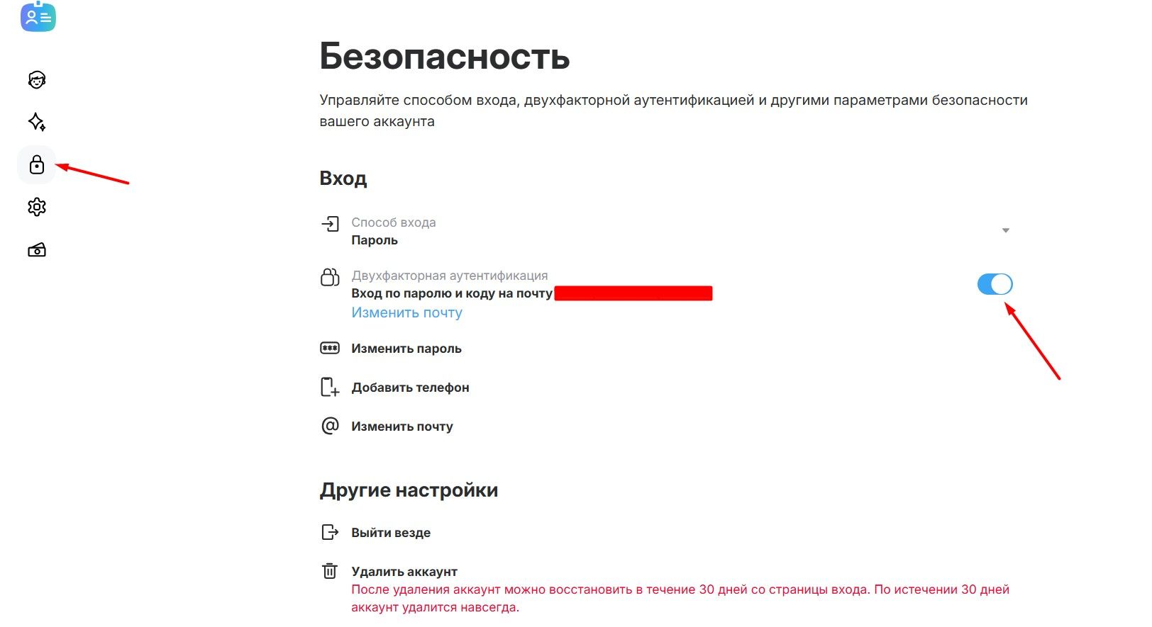 1. В блоке «Двухфакторная аутентификация» вы увидите переключатель (бегунок).