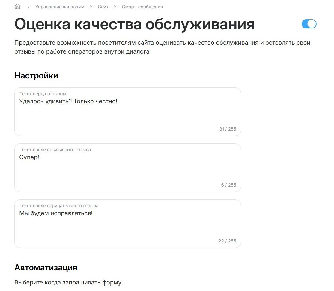 - Не запрашивать автоматически. В этом случае оператор сам решает, когда отправить форму оценки вручную (например, если видит, что проблема решена и клиент доволен).