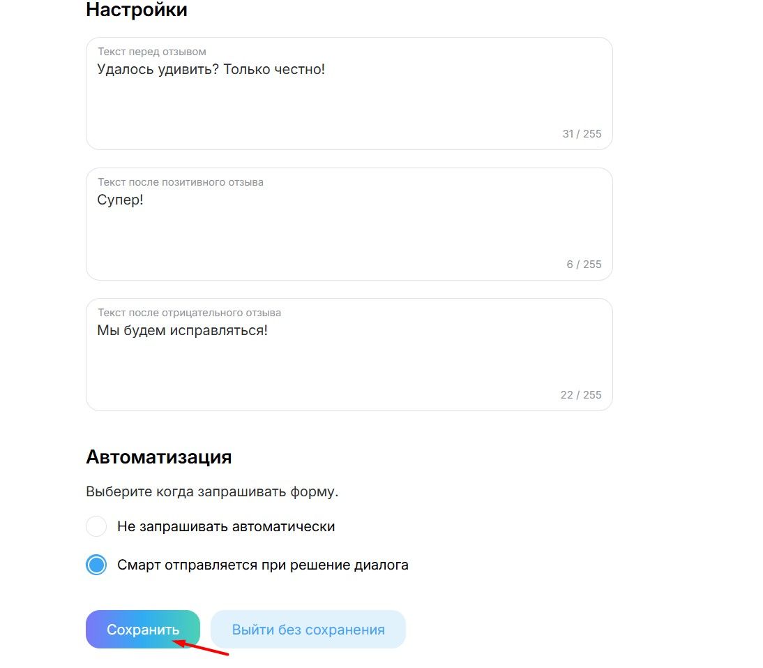 Чтобы мотивировать клиента оставить честное мнение, важно правильно подобрать слова. В этом блоке доступны три ключевых текстовых поля: