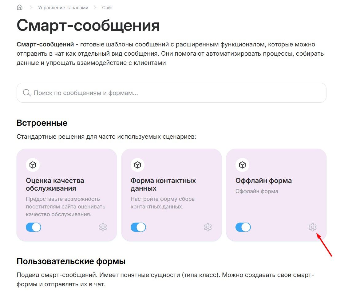 - Найдите в списке пункт «Оффлайн форма» и нажмите на иконку настройки (шестерёнка).