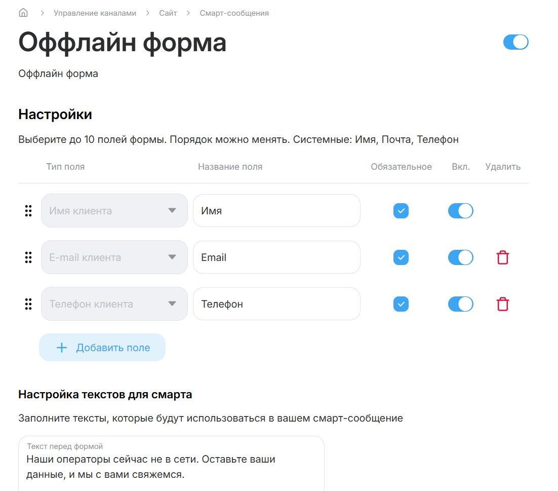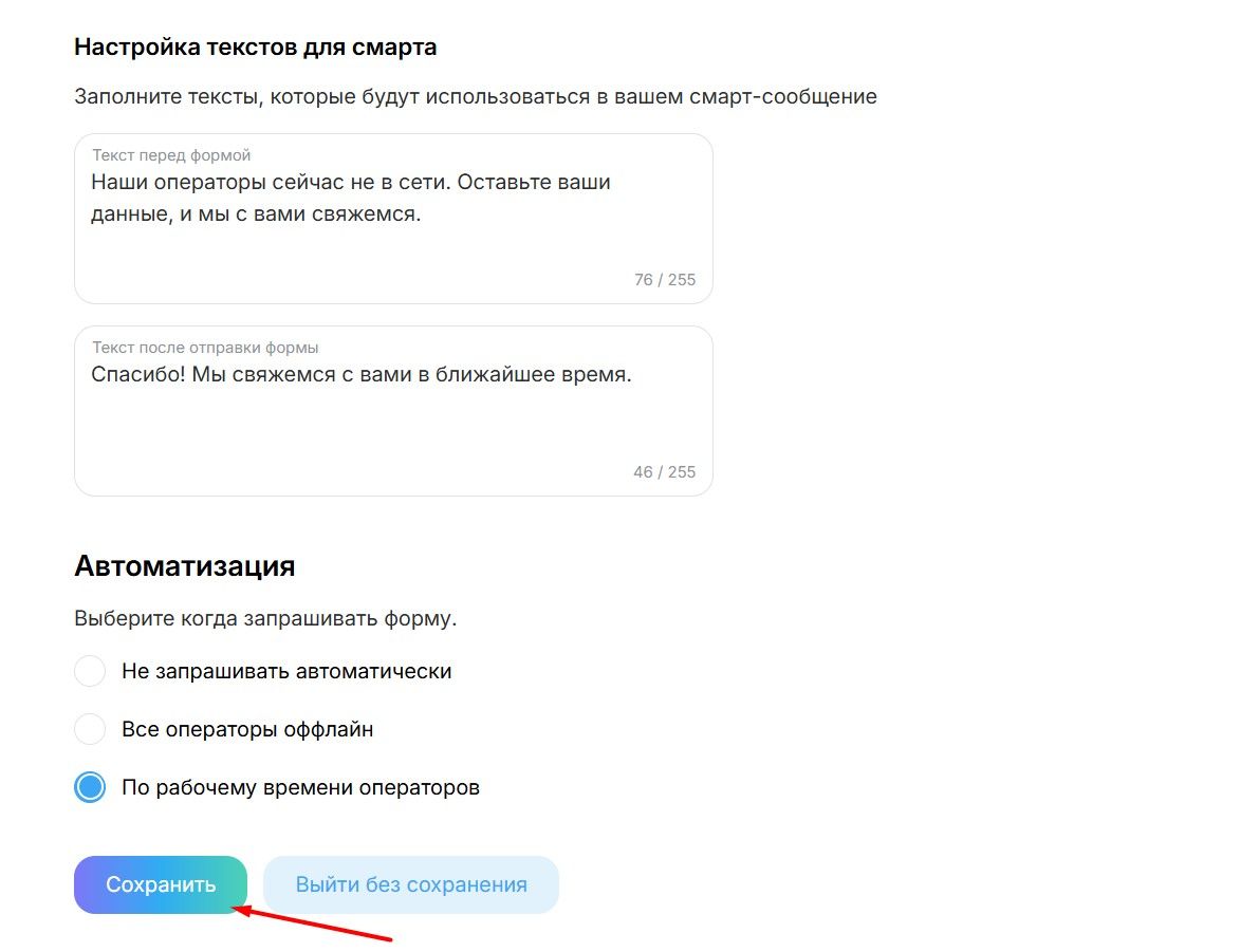 В отличие от обычного чата, который просто молчит в оффлайне, смарт-форма структурирует данные. Имя, телефон и почта автоматически попадут в базу лидов, и вашим менеджерам останется только перезвонить по готовому списку утром.