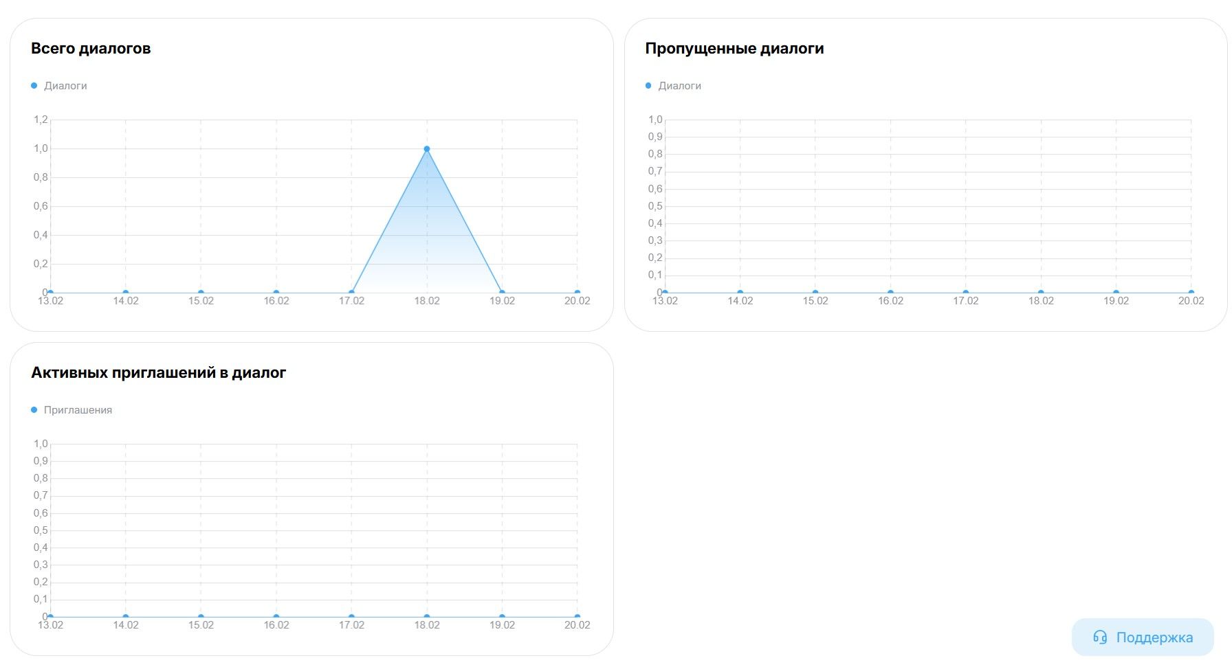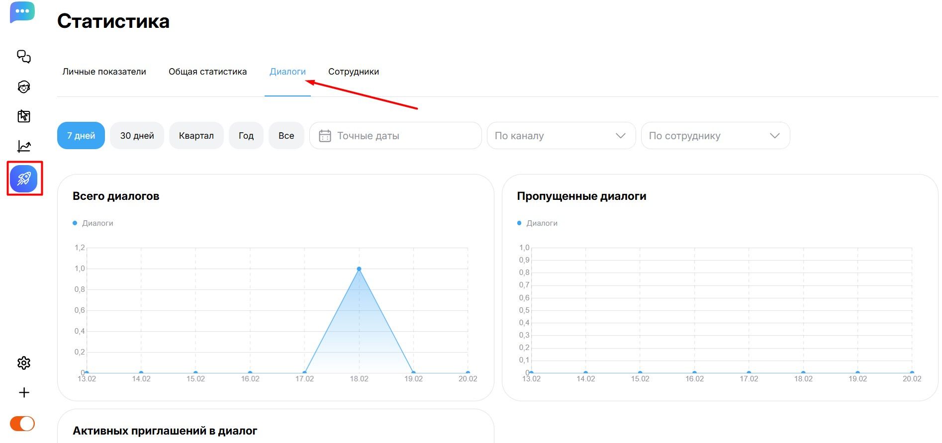 Раздел «Эффективность ведения диалогов» (Диалоги) в DiveChat предназначен для глубокого анализа работы операторов и оценки того, насколько успешно автоматические приглашения конвертируют посетителей сайта в реальных собеседников. Данные в этом разделе представлены исключительно в виде наглядных графиков для быстрого визуального анализа трендов.