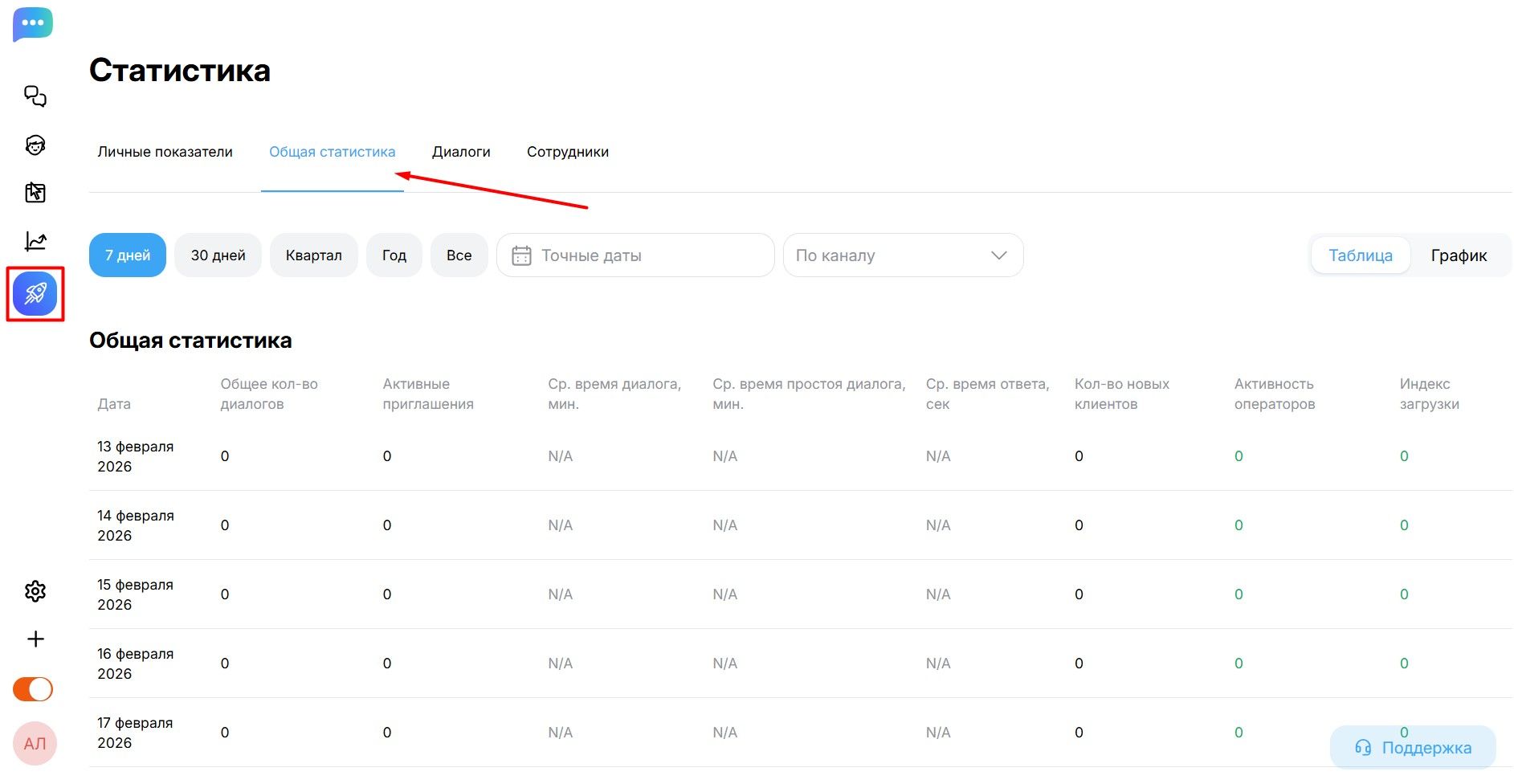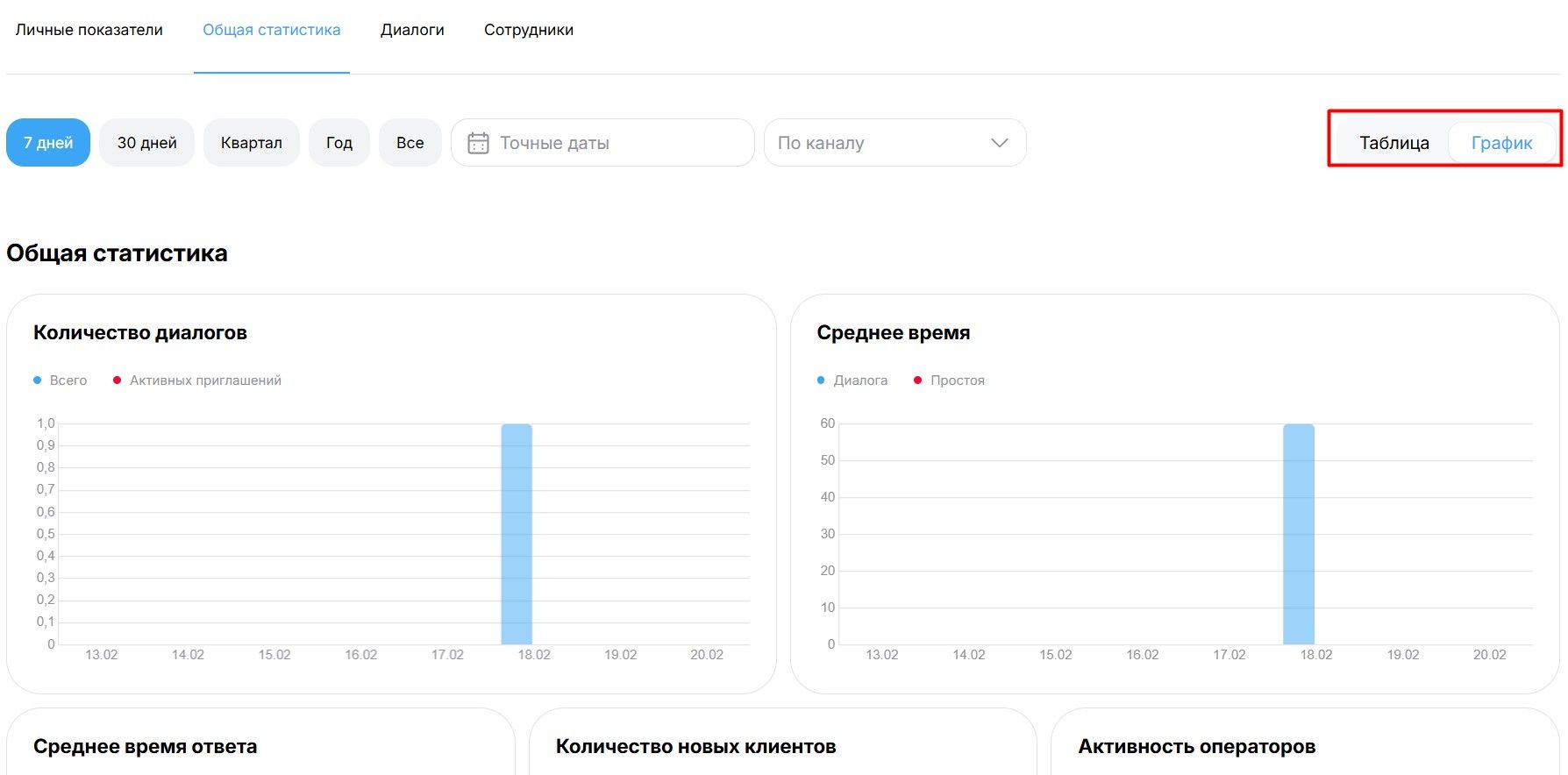 Раздел Общей статистики в DiveChat — это мощный инструмент для контроля качества сервиса. В отличие от личных показателей здесь вы видите агрегированные данные по всему проекту или конкретному каналу связи.