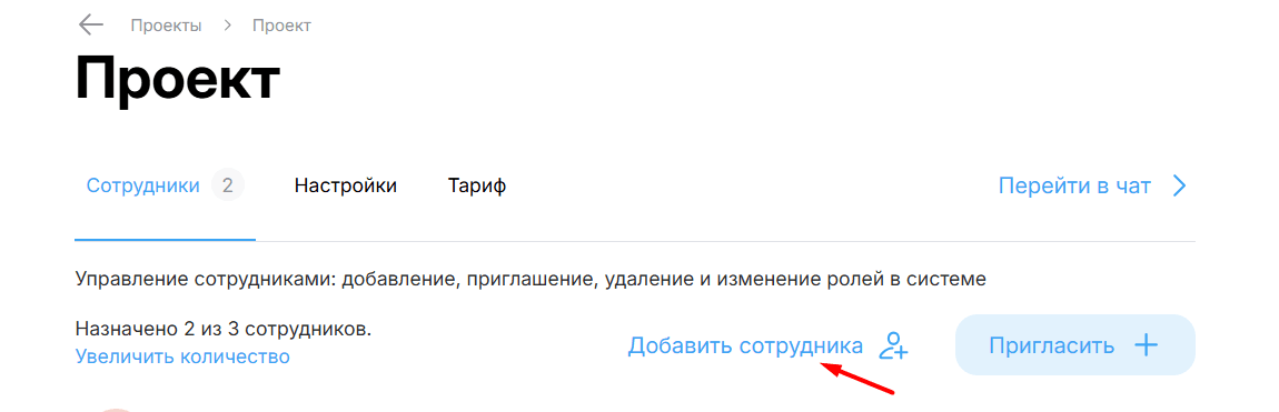 - Находясь во вкладке «Сотрудники», нажмите кнопку «Пригласить».
