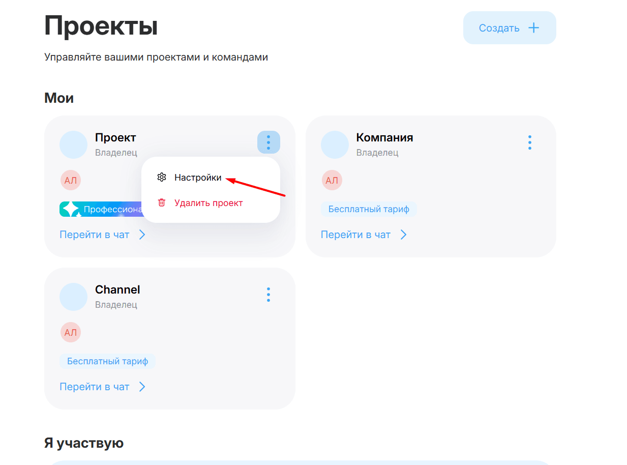 В системе предусмотрено два способа формирования команды. Чтобы начать, перейдите в Проекты → выберите проект → Настройки → вкладка Сотрудники.