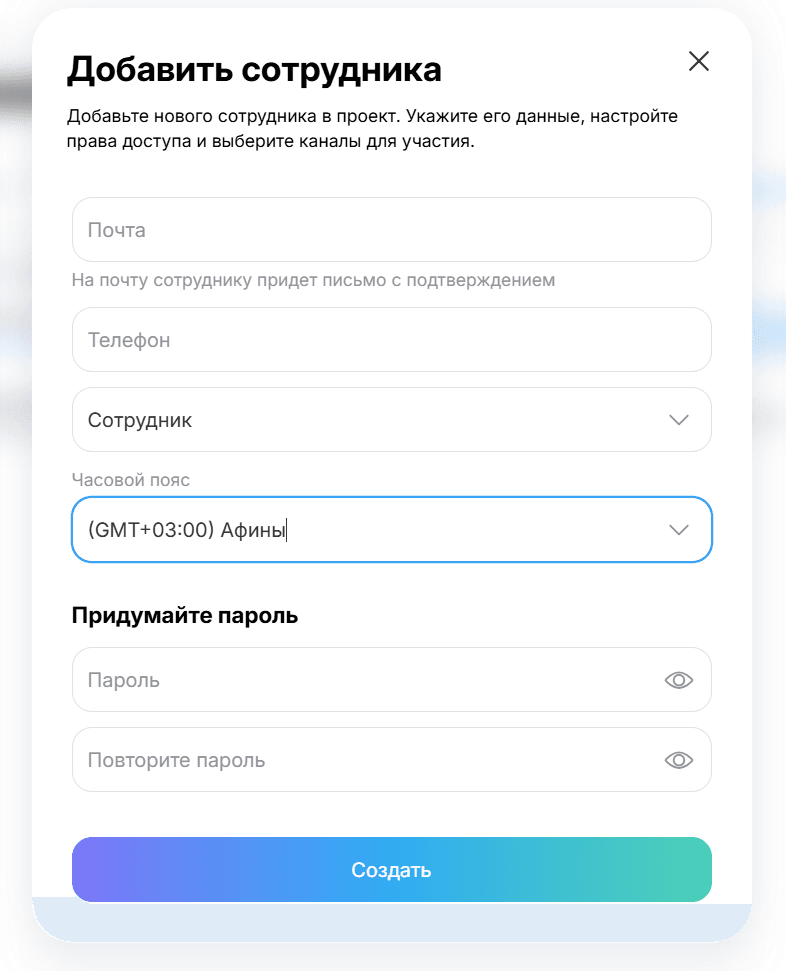 При создании сотрудника важно выбрать правильную роль, так как от этого зависят права доступа в DiveChat: