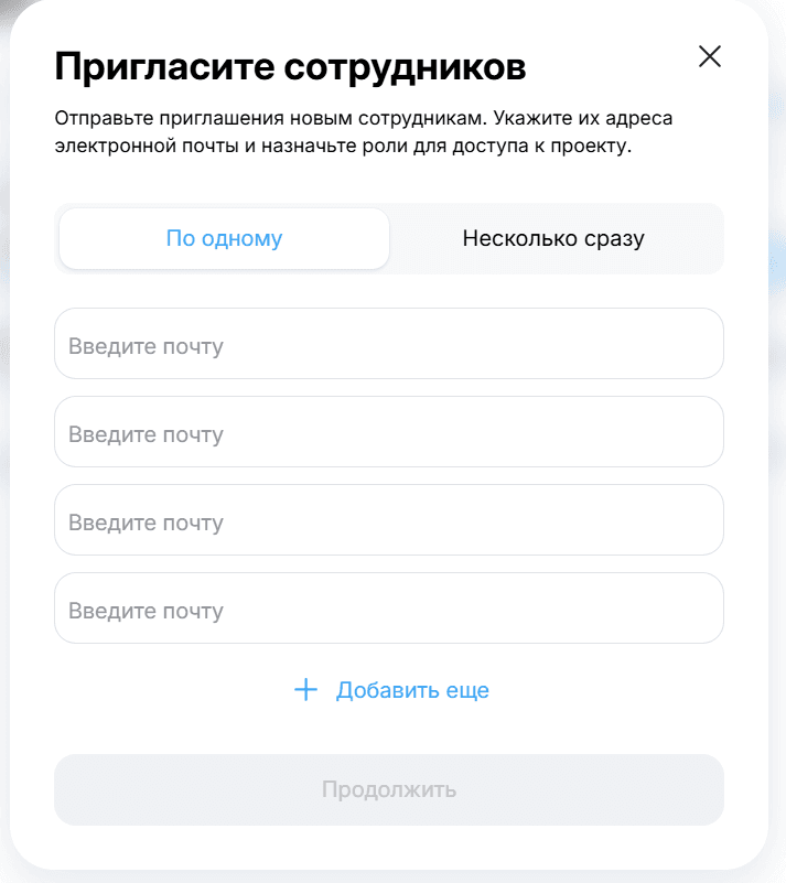Нажмите кнопку «Пригласить», укажите один или несколько адресов электронной почты и назначьте им роли. Сотрудники получат приглашение и сами настроят свои пароли.