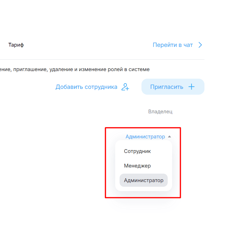 - Администратор. Имеет полный доступ ко всем настройкам проекта, статистике, оплате тарифов и управлению любыми сотрудниками.