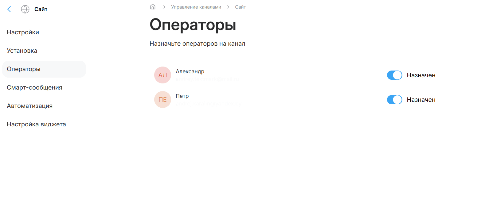 В том же меню (Операторы) нажмите на стрелочку справа от кнопки «Назначен». В боковом меню вы можете настроить, как именно этот оператор выглядит для клиентов в данном канале: