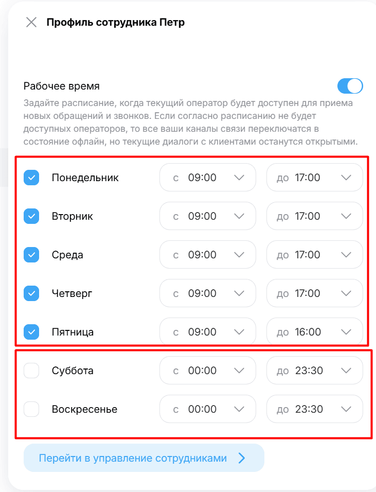 - Рабочее время. Задайте расписание для каждого дня недели (например, Пн-Чт 09:00-17:00, Пт 09:00-16:00, Сб-Вс — выходные).