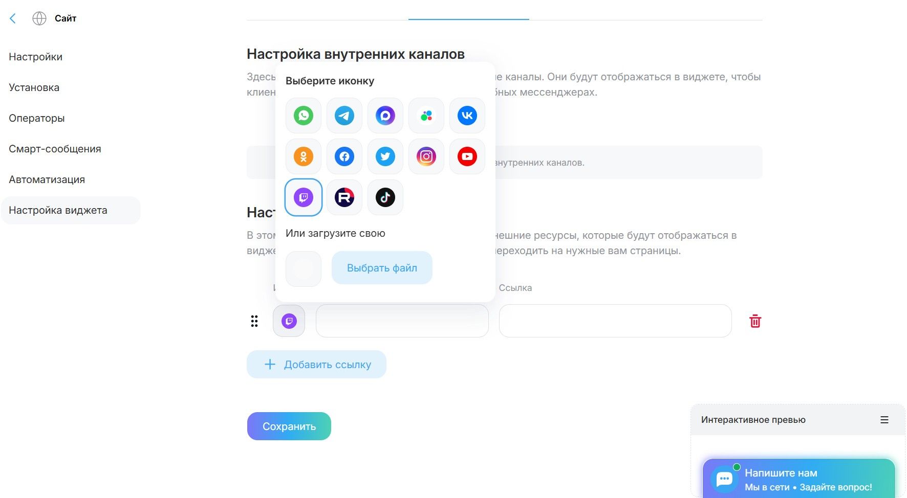 Выберите подходящий логотип из встроенной базы DiveChat. В системе уже предустановлены иконки для популярных сервисов: WhatsApp, Telegram, MAX, ВКонтакте, Одноклассники, Twitter, YouTube, Rutube, TikTok, Авито, TenChat и др.